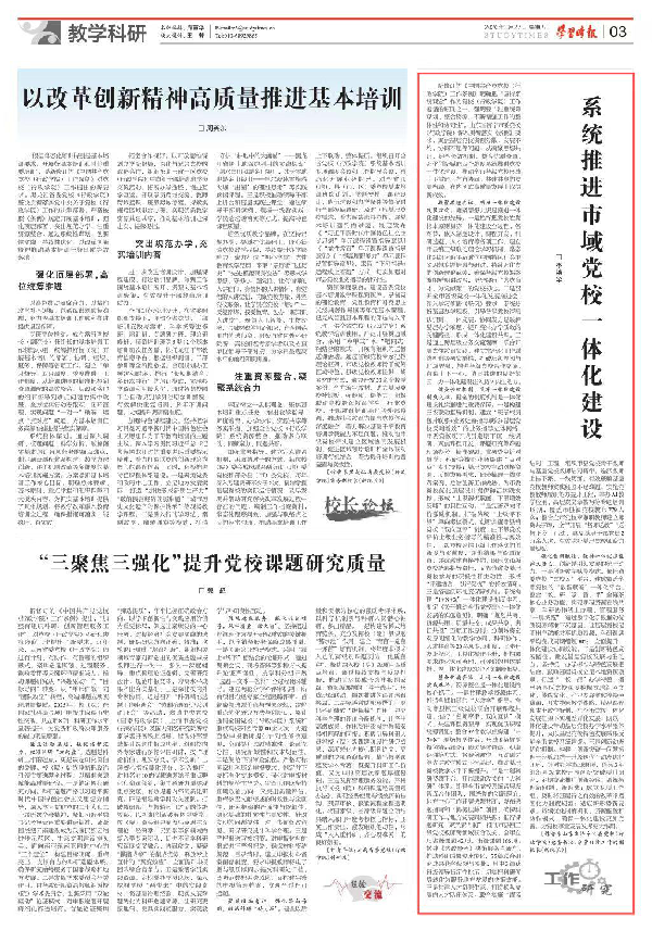 2026年3月27日,《学习时报》刊发我校(院)党委书记、分管日常工作的副校长、一级调研员李艳华署名文章《系统推进市域党校一体化建设》,该文章重点推介我校围绕“凝凝聚思想共识,明确一体化建设发展方向;健全长效机制,筑牢一体化建设制度支撑;强化创新赋能,保持一体化建设持久活力;整合优质资源,打通一体化建设实践路径”四个维度,系统推进党校一体化建设的工作经验做法。以下为全文。 系统推进市域党校一体化建设 李艳华 《 学习时报 》( 2026年03月27日 第 11 版 ) 新修订的《中国共产党党校(行政学院)工作条例》明确把“坚持系统观念”作为党校(行政学院)工作遵循的原则之一,强调要“注重统筹谋划、整合资源,不断增强工作的整体性和协同性”。山东省济宁市委党校(行政学院)深入贯彻落实《条例》要求,聚焦基层党校资源分散、发展不均、协同不足等问题,从凝聚思想共识、健全长效机制、整合优质资源、强化创新赋能四个维度系统推进党校一体化建设,推动全市各级党校形成上下贯通、左右协同、共建共享的发展格局,在内涵式高质量发展上取得新成效。 凝聚思想共识,明确一体化建设发展方向。凝聚思想共识是推进一体化建设的先导。一是始终把党校姓党根本原则贯穿一体化建设全过程、各环节,嵌入制度设计、课程开发、科研选题、人才培育等各项工作,建立市县镇三级联动理论学习机制,常态化组织习近平新时代中国特色社会主义思想专题培训与研讨,持续强化党的创新理论武装,确保各级党校始终旗帜鲜明讲政治,坚守践行“为党育才、为党献策”的党校初心。二是召开全市各级党校一体化发展推进会,深入学习领悟《条例》要求、系统分析基层办学短板,引导各级党校深刻认识到,一体发展、协同发力是破解基层办学难题、提升整体办学质效的关键路径,形成一体化建设共识。三是通过跨层级业务交流观摩、联合开展党性教育实践、建立常态化工作联络机制等务实举措,打破层级隔阂与地域界限,增进各级党校合作交流,营造上下一心、协同共进的良好氛围,为一体化建设注入持久内生动力。 健全长效机制,筑牢一体化建设制度支撑。健全的制度机制是一体化建设扎实推进的重要保障。一是构建三级联动指导机制。建立“班子成员包片联系+业务处室指导赋能+基层党校反哺增效”的业务指导立体网络,市委党校班子成员定期下沉一线调研,聚焦课程开发、课题研究等难题现场办公、精准破题;业务处室针对教学、科研等核心业务提供“点对点”专业支持;基层党校主动对接资源、反馈发展需求,同步梳理一线实践案例、总结创新工作做法,为市委党校优化顶层设计提供鲜活实践支撑,形成“上级解忧赋能、下级增效反哺”的良性互动。二是完善双向评价激励机制。打破传统“上级评下级”单向考核模式,创新实施市县镇党校“双向互评”制度,由下级党校评价上级业务指导的精准性与实效性,上级党校评估下级工作落实的创新度与贡献度,评价结果与资源配置、评优激励直接挂钩,既压实市级党校统筹指导责任,又充分激发基层党校参与的积极性和主动性,形成“评建结合、以评促优”的长效循环。三是搭建闭环制度保障机制。系统构建“1+N+X”一体化建设制度体系,制定《关于推动全市党校事业一体化发展的实施意见》,明确“规划共商、资源共用、质量共控、成果共享、责任共担”五项工作原则;分领域将宏观原则细化为教学协同、科研协作、人才共育等20余项专项制度,同步开发流程化、工具化操作手册,把抽象要求转化为可落地、可评价的具体举措,为一体化建设筑牢坚实制度根基。 整合优质资源,打通一体化建设实践路径。资源整合是一体化建设的核心抓手。一是共建教学资源体系,打造全域协同的“大教学”格局。推动市县镇三级党校联合开展课程共建,推行“名师牵手、双向互认”模式,共建课程资源库,实现优质课程统筹调配;整合82个教学点构建“1+7+N”现场教学体系,形成8条教学特色精品线路;通过集体备课、观摩评课等方式,将案例教学、互动研讨等先进教学模式下沉基层,推动基层党校教学水平不断提升。二是共建科研资源平台,打造联动攻关的“大科研”体系。组建全市党校系统跨层级智库合作团队,围绕党的创新理论、地方中心工作开展选题共商,发布选题指南和“揭榜挂帅”项目,确保科研工作与地方发展同频共振;推行课题研究“双负责人制”,推动市县镇三级党校教师跨领域联合攻关,全年立项省级课题42项、市级课题166项;搭建《咨政参考》决策服务直通车,推动科研成果快速转化,75篇联合研究成果获各级领导签批,其中3篇获省级领导肯定性批示,切实把科研优势转化为服务地方发展的决策效能。三是共建人才资源生态,打造梯队发展的人才队伍体系。联合实施“青蓝结对”工程,组织市县党校骨干教师与基层党校教师结对帮带,选派教师上挂下派、一线历练,有效破解基层党校教师实践经验不足难题;实施党校教师履职能力提升工程,举办AI教学应用、高层次文章撰写等专题培训18期,覆盖市县镇党校教师779人次;整合全市党校专兼职教师建立师资共享库,全年开展“名师送教”“送教下乡”活动,惠及基层干部党员2万余人次,有效弥补基层党校师资力量短板。 强化创新赋能,保持一体化建设持